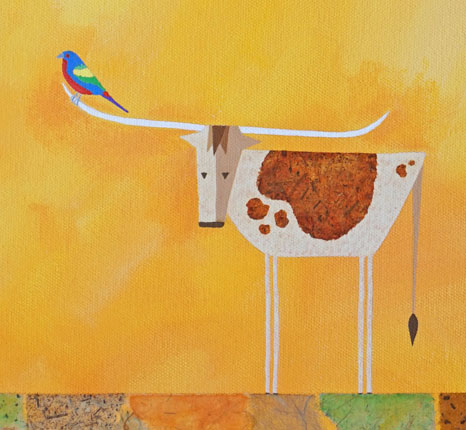 Mixed Media on Gallery Wrap Canvas 20"x16" SOLD My love of longhorns and bird watching have merged with this whimsical painting. It is always such a thrill to see the painted buntings when they arrive in Spring. (See detail image below)