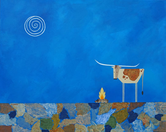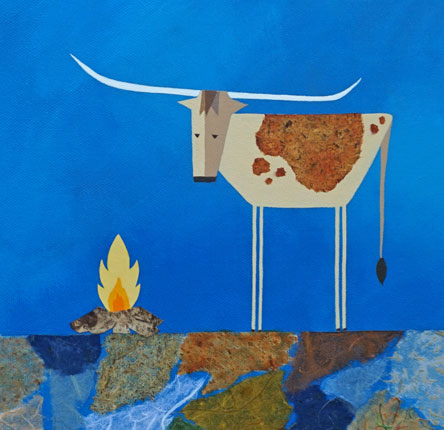 Mixed Media on Gallery Wrap Canvas 16"x20" SOLD I have many great memories of camping with my family as a child. Exploring the woods, hunting for jade in shallow waters and gathering by the campfire. This longhorn painting pays tribute to these special times. (See detail image below)