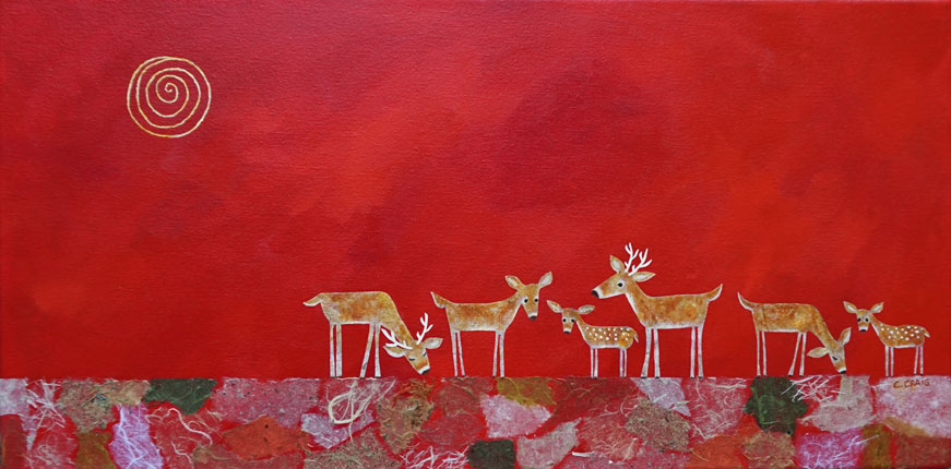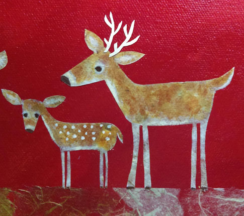 Gallery Wrap Canvas 12"x24" I finally decided to paint deer, a new subject that is a very familiar sight in my neighborhood. (See detail image below) Whimsical modern mixed media collage art painting stylized deer with red sky. |