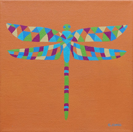 An abstracted dragonfly on a bright orange background.