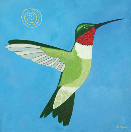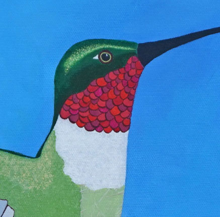 A ruby throated hummingbird, and my first hummingbird painting. These nimble, tiny creatures are such a delight to watch. (See detail image below.)
