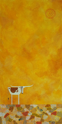 A longhorn with warm golds, yellows and oranges in an exaggerated vertical format.