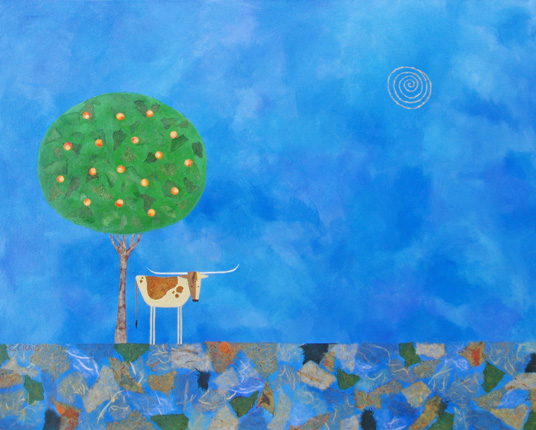 Gallery Wrap Canvas 24"x30" The Texas hill country is famous for peaches and for this I am thankful, since I too am partial to them. Longhorn with peach tree painting. |