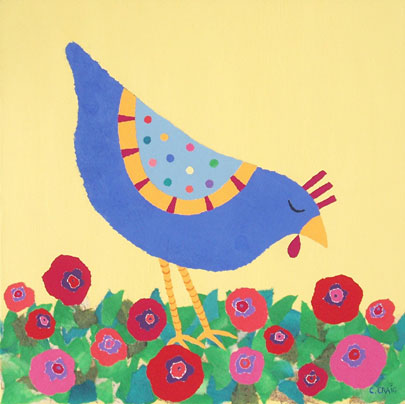 A whimsical hen in a field of stylized poppies, part of a trio of hen and flower paintings.