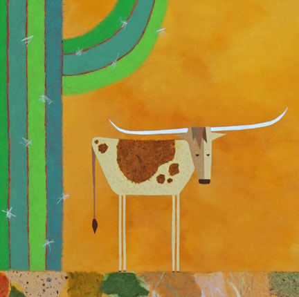 A longhorn with a saguaro cactus, each with their sharp points. I love the title, courtesy of my husband. (See detail image below)