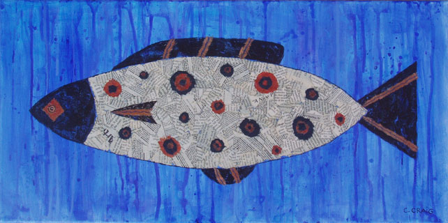 Swimming in Good News I, I collaged the Wimberley newspaper into the body of the