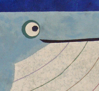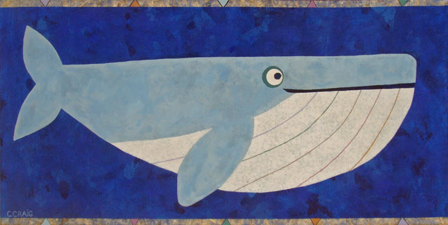 Prints on canvas & paper available. stylized whimsical whale painting on blue background with border |