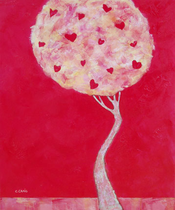 Mixed Media on Gallery Wrap Canvas 24"x20" $975 One of two whimsical and textural paintings of hearts growing on a tree. A rich red background and an abundance of hearts for the tree and heart lovers.